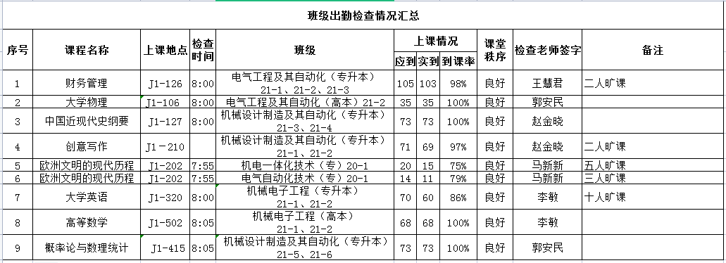 在课前,辅导员老师与任课老师深入交流,沟通学生近期的学习态度和班级学习氛围,进一步了解学生们的学习状态。本周学风督察行动,对电气工程及其自动化(专升本)21-1、21-2、21-3、电气工程及其自动化(高本)21-2、机械设计制造及其自动化(专升本)21-3、21-4、机械设计制造及其自动化(专升本)21-1、21-2、机电一体化技术(专)20-1、电气自动化技术(专)20-1、机械电子工程(专升本)21-1、21-2 、机械电子工程(高本)21-1、21-2、机械设计制造及其自动化(专升本)21-5、21-6、电气自动化技术(专)21-1、机械设计制造及自动化(专)21-2、机械电子工程(专升本)21-1、21-2、机械制造及自动化(专)21-1、机电一体化(专)21-1、电气工程及其自动化(本)20-2共18个班级,进行了检查,整体到课率达到93%,具体检查情况如下: