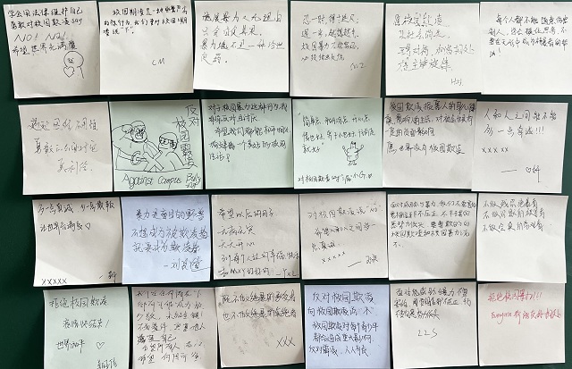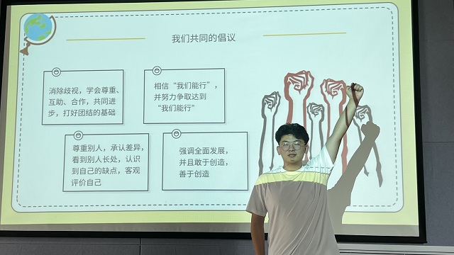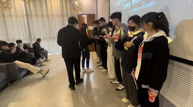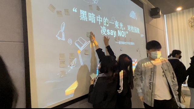 在第一环节“有奖问答”环节通过电脑随机抽取“天选之子”进行作答,通过问答进一步了解校园欺凌。刘老师还为答对题目的同学准备了“惊喜”热奶茶,同学们在奶茶中品尝着收获的喜悦。在第二环节“无剧本演出《校园欺凌》”中,同学自告奋勇分饰不同角色,在无剧本只有旁白的情况下推动剧情发展,让我们观看表演的兴趣越发期待,将现场氛围推至高潮,程明同学饰演的“大霸”角色属实震惊到了我们,意犹未尽。在第三环节“嗨!同学你好!”中,同学们每人领取了一张“心愿”便签纸,将想说的话在纸上一一“讲述”,写下了对美好友情的憧憬、对共度幸福校园生活的期盼并张贴到墙上展示,让本就充满爱的数媒一班继续升温!在第四环节中,同学们观看有关于校园欺凌的视频,生动形象地感受到校园欺凌性质的恶劣,使大家真切地学习、预防校园欺凌以及遇到校园欺凌的应对方式,让我们发自内心的抵制校园欺凌。