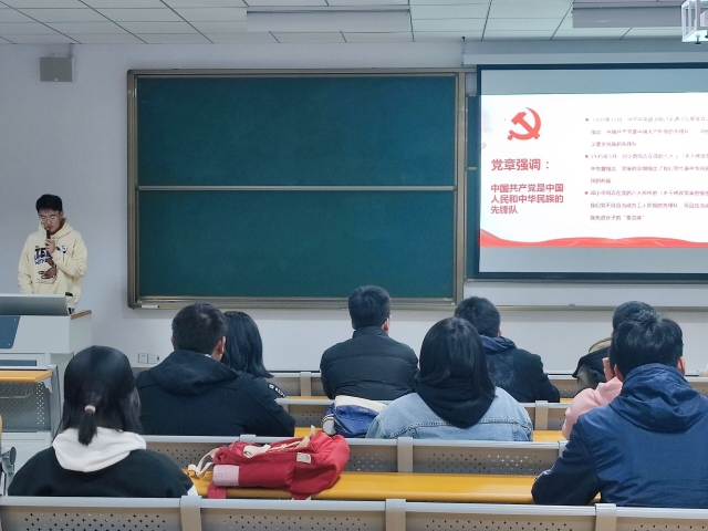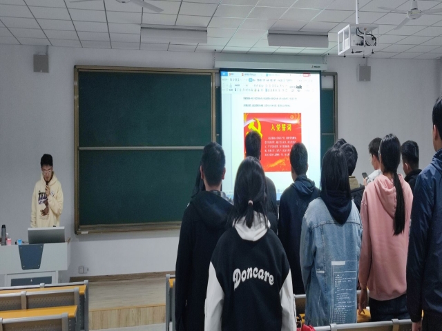 听完刘老师的分享,本次培训正式开始,主讲人组织部部长鲍智贤首先针对党的光辉历程、党的性质、党章等内容进行了讲解,中国共产党是中国工人阶级的先锋队,也是中国人民和中华民族的先锋队,这是长期以来我党不变的章程,这也印证了我党以“为人民服务”的宗旨。同学们认真听讲,不时和主讲人进行互动,主讲人问道有哪位同学知道中国共产党的指导思想都有哪些,土木工程20-4班的李庚乐同学回答道“马克思列宁主义、 毛泽东思想、邓小平理论、“三个代表”重要思想、科学发展观。”的答案,完全正确,表现出同学们思想上一直在保持进步,对党的相关知识都有所认识。在讲解完党的主要纲领后,主讲人鲍智贤带领大家一起宣读入党誓词,让同学们更进一步树立入党的信念,端正入党的动机。