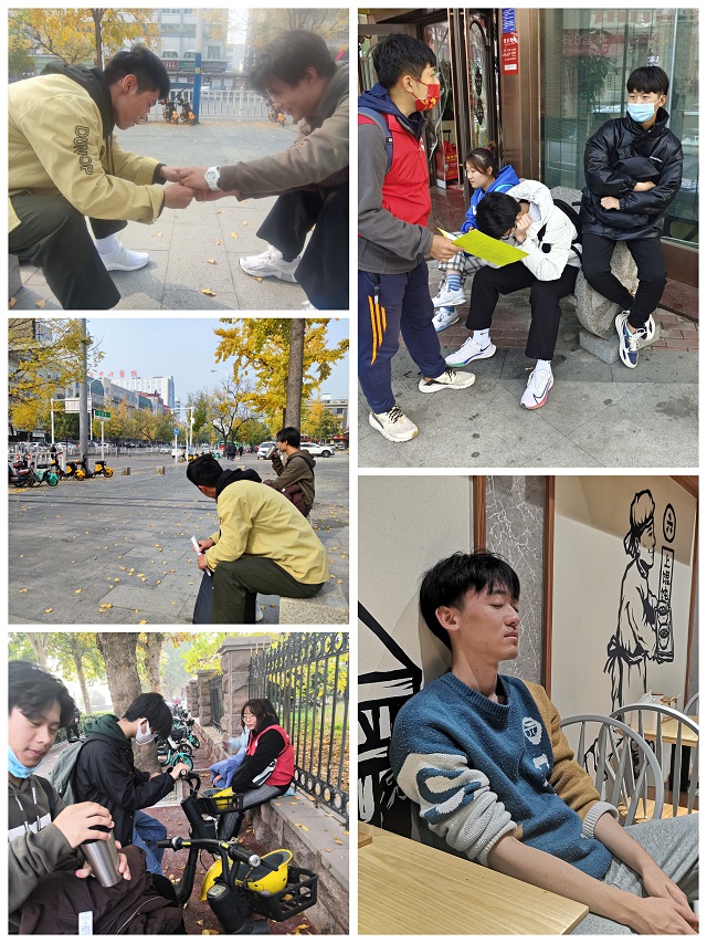 经过了两天的历练,“雪花队”表现尤为突出,在兼职中共赚取一千零五十块钱,生活条件日益改善,并成功完成比赛任务。其他队伍也非常努力,成功完成基本任务、找到了住宿的地方。经历了一起挨饿受冻,经历了一起风吹日晒,经历了一起精疲力尽,团队的每一名成员在感念社会残酷的同时也深刻感受到了团队的力量。临近活动结束,各队队员都自愿录制视频,描述这两天在城市中的艰辛,描述与团队成员在一起的小温暖,表达自己对父母表示感恩。周四下午4:00,全员在岱庙广场集合,各队拿出自己旗子,在集体拍照中都拉出一个大大的笑脸,那是他们对自己劳动过后的满足与欣慰。
