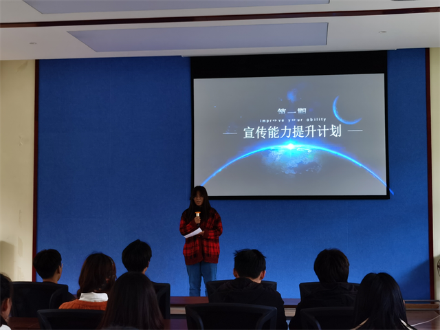 第一部分名为“通过视频走进宣传工作”。现场宣传干事通过观看视频中学长学姐的工作从而了解宣传工作;第二部分名为“通过实例走进宣传工作”。过程中宣传部长张莹说明了宣传能力提升计划活动的相关工作安排,结合上月建筑工程学院、艺术传媒学院开展的迎新晚会和志愿者活动两例时事让各部门干事初步解读宣传工作的思想和工作者应该具备的思维模式。