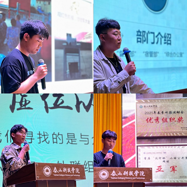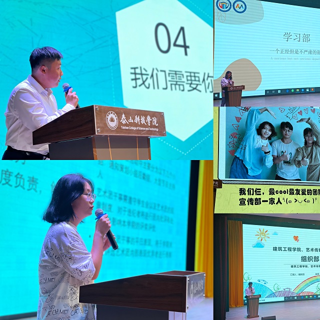 本次上台进行部门介绍共有九大部门,依次为体协、青协、社团、艺术团、组织部、宣传部、办公室、调研部和学习部。各部门由部长上台通过图文并茂的方式进行汇报,围绕部门的人员配置、部门主要工作条目、部门工作氛围等话题展开陈述。各部门部长特色鲜明,有的严肃认真,有的幽默风趣,始终吸引着台下新生们的目光。例如,在社团服务部的部门介绍中,部长白钰洋使用诙谐的语言风格进行介绍,不仅缓解微带枯燥气息的现场氛围,而且使得大家笑得前仰后翻,整个纳新会充满了轻松、欢乐的氛围。最后由各部门部长对新生们传达自己的期许,随后部门介绍顺利结束。