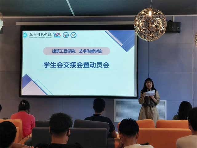 范月月老师致开场词,向同学们介绍新加入的辅导员刘倩倩老师,同学们用热烈的掌声表示了欢迎。随后由负责各部门的主席团成员公布学生会换届工作的结果,主席团成员赵学鑫饱含深情表达了对各部门干部的寄语与期许,她说道:“现在学生会已经以可视见的速度在成长、在进步,我相信20级的各位学生干部,因为有你们,建筑工程学院、艺术传媒学院学生会的发展会越来越迅速。希望在座的各位共同努力,我相信一切都越来越好!”在一片掌声中,会议进入下一阶段。