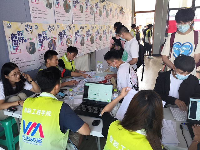 早上8点整,最后一天的迎新工作拉开了序幕,满怀梦想的莘莘学子陆续到达智能工程学院迎新点,寻找自己的导员和“西北屯”代班开始进行入校手续。“查验身份、录入信息、领取校园卡、确认签字”。一切手续井然进行,快捷高效