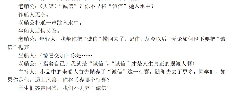 话说诚信。诚信宣传片播放。让学生了解“诚信”的概念、表现、作用、意义等。用理论上认识“诚信”。