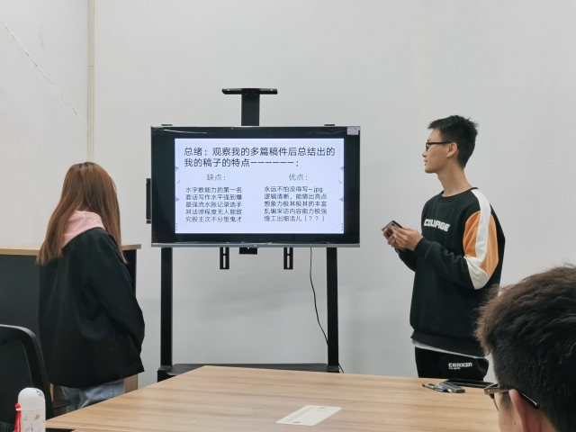 随后,经过干事们激烈的讨论,总结出如下问题:文采不够和文章内容主次不清。宣传部部长陈帅进行解答,并做出拓展与延申。看着斗志昂扬的学弟学妹们,社团服务部部长韩赞儒不禁感慨道:“我和你们陈帅部长一路走来真的不容易,从面对部门刚成立的物资短缺、人才短缺等困难,到后来的新闻稿瓶颈,这一段时光虽有辛酸,但我始终相信付出就会有回报,并且因为看到了你们,我看到了希望。假以时日你们定能撑起建筑工程学院的顶梁柱,中流砥柱之力。”