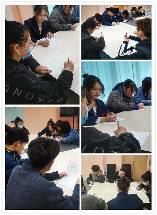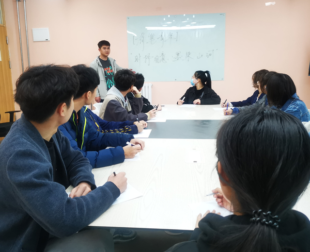 活动开始后,主持人首先介绍此次活动的内容,最有意思的是活动主题由参加者确定。参加同学进行自我介绍后,为选定主题展开热烈讨论,大家纷纷提出自己的想法,山河、花草、故乡、梦想等。每一个主题都有它独特的寓意,经过一番讨论最终确定“时抒旧意,墨染山河”作为此次活动主题。活动开始之后,大家纷纷以诗歌形式写出自己的所感所想,用诗歌的美描绘出自己心中那壮丽的山河。