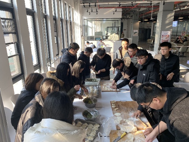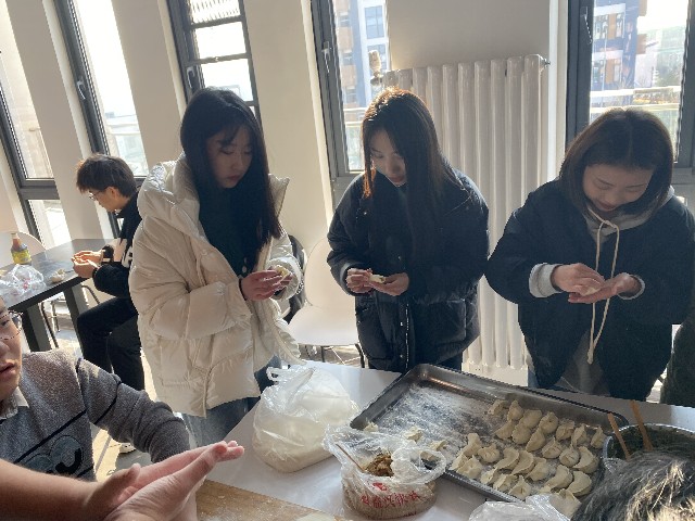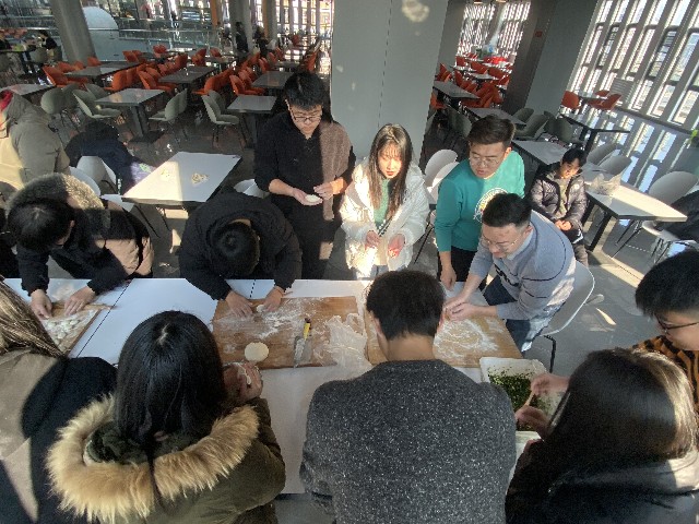 上午10点活动准时开始,刚进餐厅,同学们就飞快地跑向包饺子的位置。餐厅工作人员先给同学们做了示范。接下来同学们个个都大显身手。随后,同学们围坐在一起,和面的和面,擀皮的擀皮,包饺子的包饺子,放饺子的更是把饺子放得错落有致,场面很是精彩,虽然出现了奇怪的饺子,但那是每个人亲手创造的成果,同时更体现了各个地方的不同风俗和饺子样式。大家围绕学习、生活、工作等话题,不时地交谈着。每组同学别出心裁地包着饺子并设计成各种形状,有精致小巧的柳叶饺,也有个大饱满的东北饺。