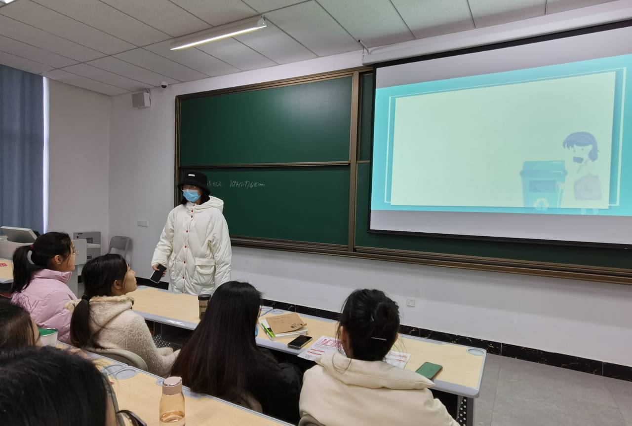 活动开始,由禚慧慧同学作为讲解人,通过PPT的形式向同学们讲解关于垃圾分类的知识。垃圾分类可以最大限度的实现垃圾资源利用,减少占地减少污染,减少垃圾处置量,改善生存环境质量,降低垃圾对于地下水的污染。讲解期间,同学们认真听讲,积极学习有关垃圾分类的知识。