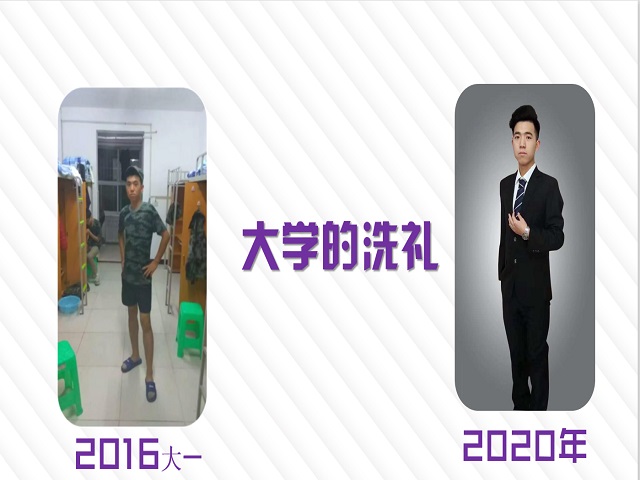 分享会刚开始,牛宇超学长将自己刚入大学时土里土气的照片和如今帅气阳光的照片放在了一起做了对比。刚进入大学的他内心有些自卑,连面对镜头时的笑容都有些尴尬。而如今,学长西装笔挺,虽然脸上没有微笑,却给人一种阳关的感觉。这让同学们对接下来的分享更加感兴趣了。