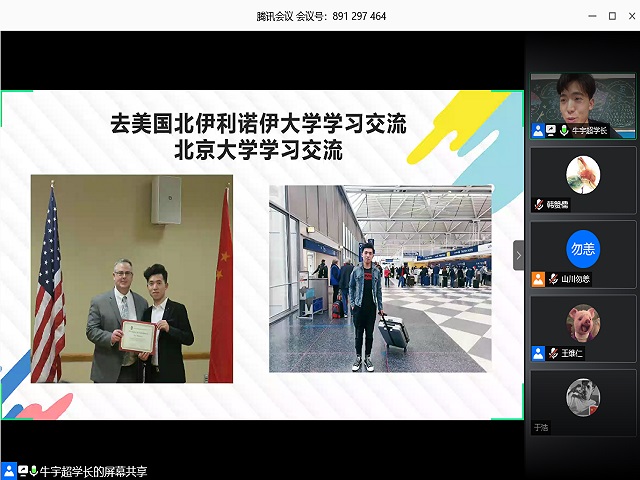 因为在学校的各方面表现都十分优秀,牛宇超学长在经过两年的刻苦努力后,终于拿到了前往伊利诺伊大学学习交流的机会。牛宇超学长告诫我们:“永远待在学校的宿舍里打游戏而不去外面看看,你终究无法进步。我在其他学校学习交流后才明白我所取得的成绩根本不值一提。我希望你们可以像我一样去外面走走,开阔自己的眼界,你才能知道自己和别人的差距在哪。”后来,牛宇超学长又去往北京大学学习交流,在那里,他看到了学生们对知识的渴望和对生活的热情,这让他坚定了要成功的决心,也坚定了赶超这些在名牌大学学习的学生的愿望。