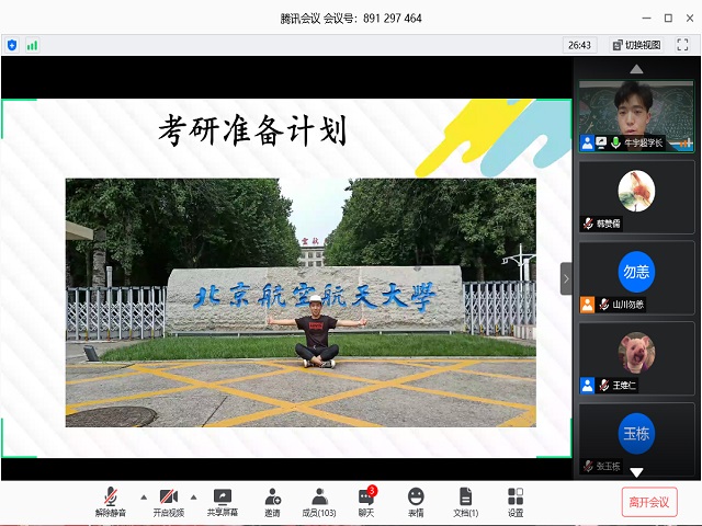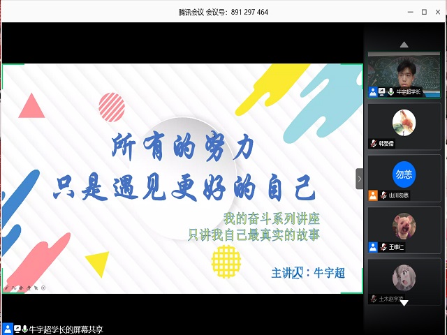 在经过长达五个月的假期及居家网课之后,智能工程学院、建筑工程学院两院同学终于回到了学校。如何及时将假期慵懒的生活方式拉回积极的校园生活成了每位同学必须面临的问题。为了让同学们能够尽快的适应学校的学习生活,6月3日晚七点,智能建工全体同学准时加入腾讯会议,参加由山西农业大学信息学院的牛宇超学长主讲的“所有的努力只是遇见更好的自己”分享会。希望从学长成功的故事背后得到关于人生的帮助。