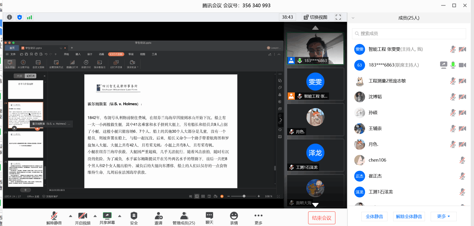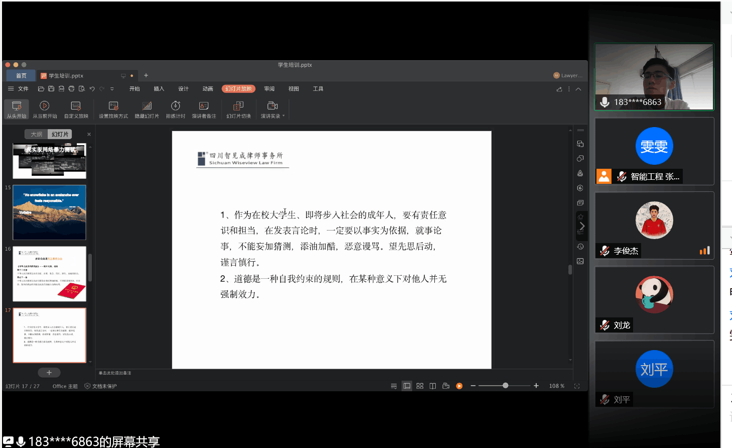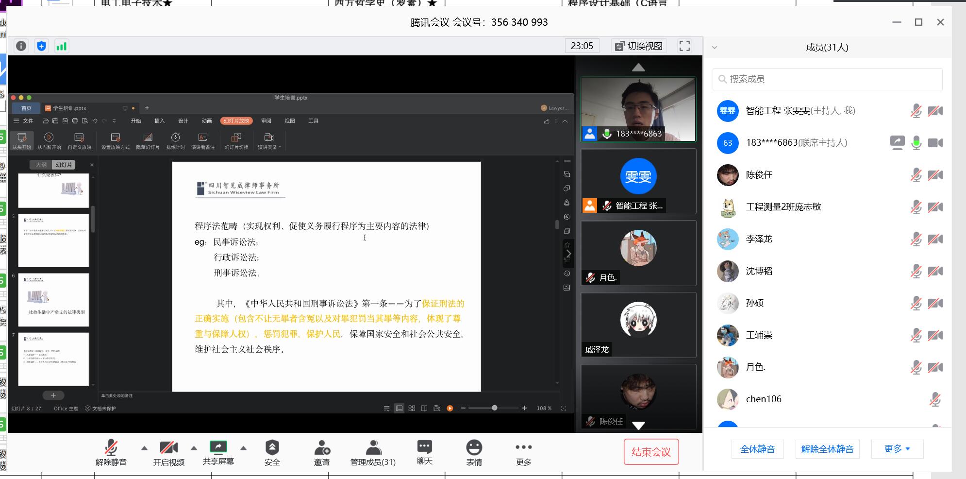 为普及法律知识,启迪法律思维,提升同学们的维权意识和维权能力,有效预防各类可能侵害在校大学生合法权益的案件发生,努力构建和谐、平安、文明校园,智能工程学院、建筑工程学院于6月5日分5个场次,开展了“智能建工普法云讲堂”法制宣传教育活动。本次活动特邀请了四川智见成律师事务所张汇律师进行了题为“在法律门前”的分享。