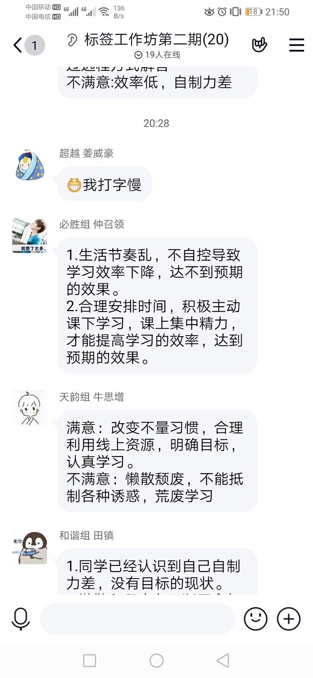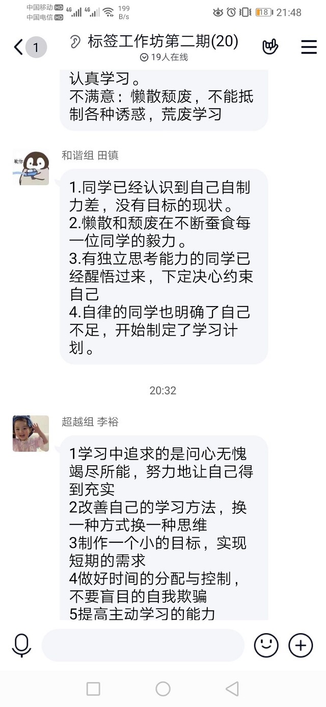 在激烈的讨论中完成了本次便签活动的主题。并评选出李裕、田镇两名最佳便签官和姜威豪、孔潇、韩新波三位优秀便签员。通过第二期便签赋能计划,使同学们对自律有了更深的认识,相信通过更多同学的加入,便签赋能计划会越来越好。