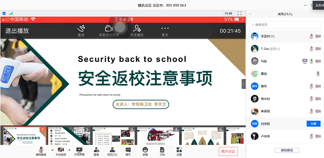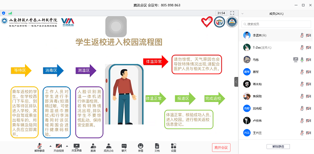会议最后,李天文老师用《学生返校进入校园流程图》分别讲解入校前的具体流程检测流程和每个检测区域的具体作用,并以宿舍楼与教学楼等人员聚集处为深入点,展开重点安全防范讲解。