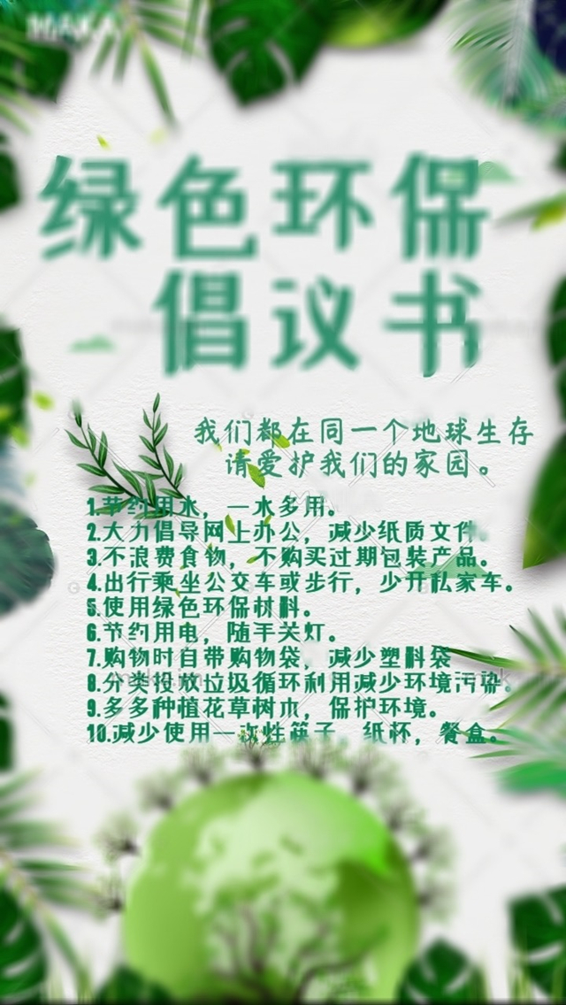 我制作了一张倡议书,为突出倡议内容的重要性,我将四周虚化,并把倡议内容列出。整张倡议书四周用的是绿色。绿色既代表植物,又代表环保、生机、活力。我呼吁大家保护环境,保护地球,我们都在同一个地球上生存,请爱护我们的家园。