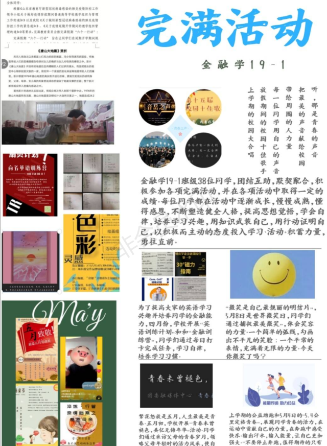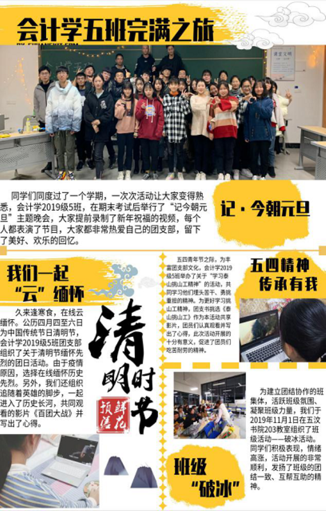 会计学2019级5班团支部是一个积极向上,团结协作的集体,在上学期举办多次主题活动,同学们积极参加,认真完成,一起享受着完满之旅带来的乐趣与进步。这张简报挑选了班级的4次活动,其中包括:记·今朝元旦、我们一起“云”缅怀、五四精神传承有我、班级“破冰”,简报对这些活动进行了介绍并配上了一些活动照片。这四项活动开展的非常成功,也极具意义,同学们也非常积极认真,很好的体现了会计学五班团结的精神、协作的力量和丰富的班级文化生活。