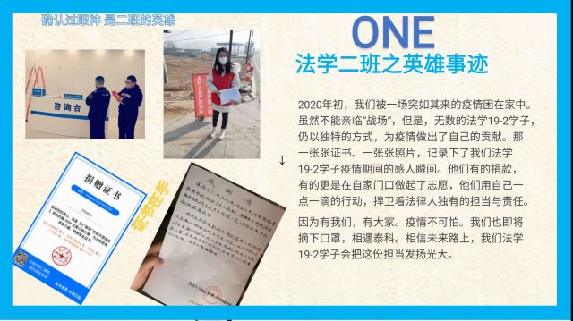 法学2019级2班团支部的学子,以独特的方式,为疫情做出了自己的贡献。那一张张证书、一-张张照片,记录下了我们法学学子疫情期间的感人瞬间。他们有的捐款,有的更是在自家门口做起了志愿,他们用自己-点一滴的行动,捍卫着法律人独有的担当与责任。