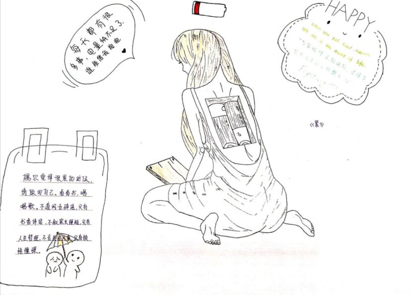 以笔言志、以墨传情,用笔墨或写或画出自己印象深刻的心理小故事,金融学一班开展一期以“绘心情,会生活”为主题的心理活动。积极向上的心态是成功者最基本的要素,同学们通过分享自己印象深刻的心理小故事,鼓励同学们,要保持乐观的心态。多名同学以心理插画的形式反映心底的声音,“拔河之争”、“平衡”、“触不可及”、“发泄、释放”、“雨or泪”、“羁绊”等等一系列心理插画,用寥寥数笔,展现内心世界,把那些隐藏在现实背后的声音,变成一幅幅抽象的、能反映各种心理问题的插画,并借助这些心里插画,鼓励大家勇敢面对这些声音,遗忘过去,乐观积极地面对有限宝贵的人生。