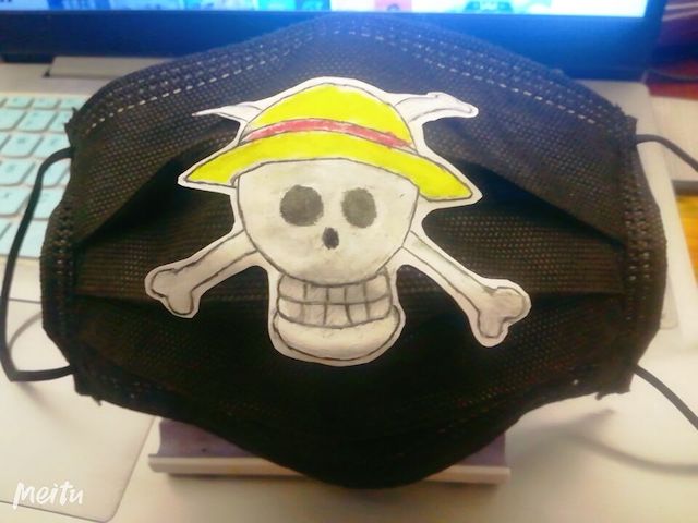 我所做的口罩,稍微看过一点《海贼王》的人就能一眼看出来,这是路飞船上的草帽骷髅,我将它画了出来,在找到与骷髅相符颜色的口罩,巧妙的组合之下,才由此诞生,我祝愿各位可以像路飞一样不畏艰险,永不退缩,草帽精神永远陪伴你。