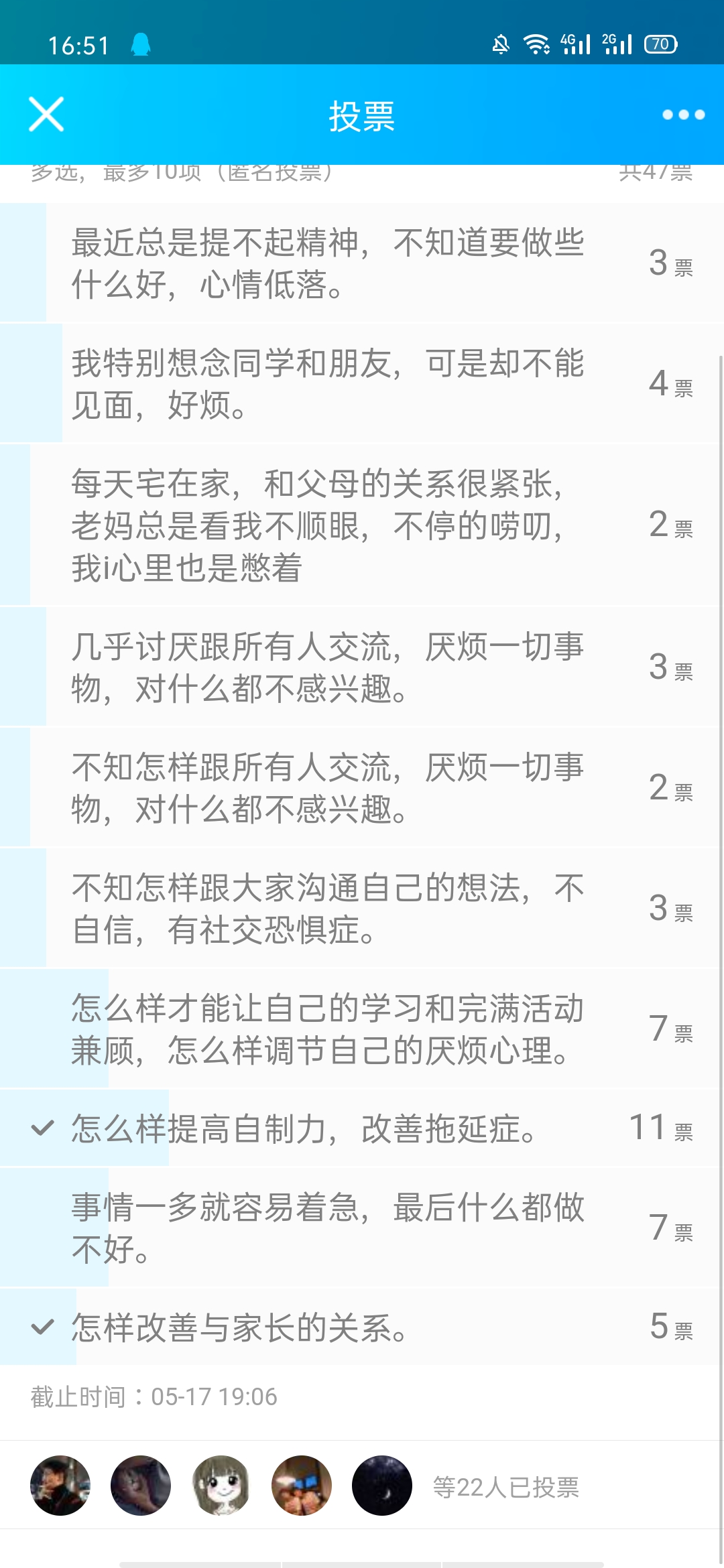 通过事先的问卷调查和投票基本了解了同学们目前的心理状况,使活动更加有针对性,心理问题无小事,针对所有出现的问题我们都进行了相应的探讨,并提出了一系列的解决方法。