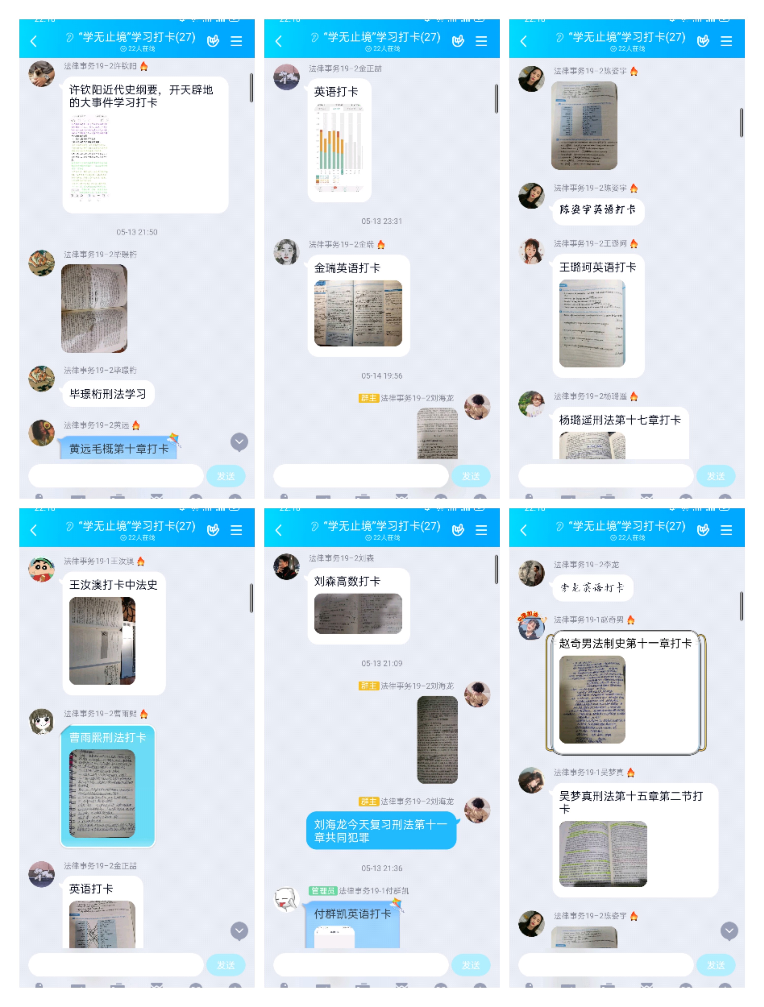 学而不思则罔,思而不学则殆。为营造良好的学习氛围,增强同学们的法律学习热情,避免线上学习产生的懈怠、弥补线上学习的缺陷,为即将到来的线下学习打好基础,法律事务专业的同学们于5月13日开展为期21天的学习打卡活动。