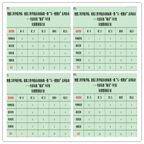 五一假期已经结束,“生活垃圾瘦身‘0’计划”活动也落下帷幕,通过各种图表可以看到同学们逐渐学会了如何对生活垃圾进行合理处理,从而能够有效提升生活物品的利用率。此次活动向两院学生传达了健康、积极的生活理念,文明从减少垃圾开始,活动虽然结束,但是行动仍在路上,倡导两院学生从身边做起、从点滴做起,齐出一份力、同尽一份心、共担一份责,为美丽环境建设贡献力量!