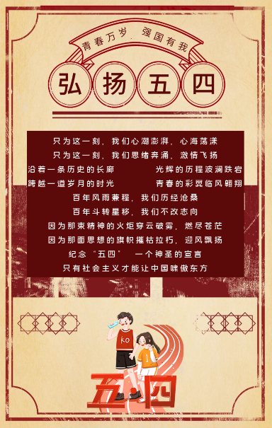 大家通过一些活动参与其中。追寻火红岁月,奏响青春乐章五四101周年,燃烧青春热血。