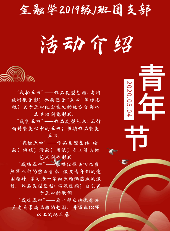 为了迎接五四青年节,2020年5月2日至5月4日金融学2019级1班团支部开展此次团会,并且希望大家可以通过一些活动参与其中。追寻火红岁月,奏响青春乐章五四101周年,燃烧青春热血。
