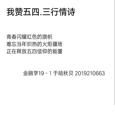 今年五四运动是第101年,可它的精神没有过时,爱国、进步、民主、科学。它始终激励着一代又一代的中国青年,特别是青年共产党员,他们又发展丰富着五四精神。五四精神是我们的光荣传统。我们新时代的青年更要继承和发扬好我们的五四精神,为中华民族的伟大复兴作出自己的贡献,青年学生要通过奋斗创造新时代新奇迹,通过学习增长才干,锤炼品德修为。日常学习工作中实事求是,不徇私舞弊,不投机取巧,不阿谀谄媚。信息爆炸的时代,不要做毫无无理智的网络喷子,不要成为网络暴力的帮凶,不要成为万事悲观主义者,高素质高教育背景下应该学会明辨是非,不人云亦云,同时,为人处世要学会饮水思源,与身边人取长补短,互相信任帮助,让蓬勃的朝气遍布社会。自古英雄出少年,我们要做的还有太多太多,愿我们携手奋进,为中国特色社会主义新时代做出自己的贡献!