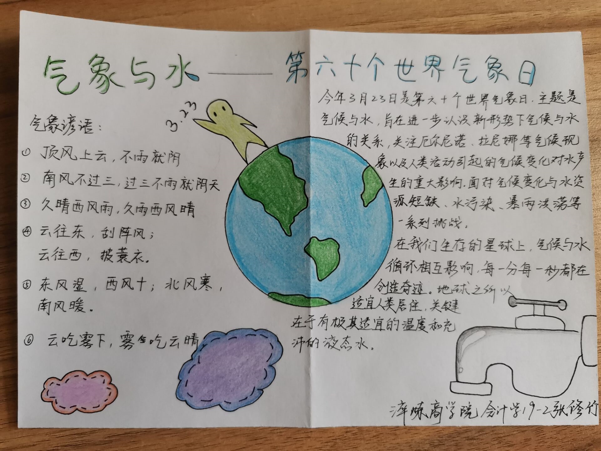 2020年3月23日,是第60个世界气象日,此次世界气象日的主题是“气候与水”。水是气候变化最重要和最直接的影响领域,气候变化影响可以通过水来感知。同学们足不出户,通过观看科普视频、手抄报等形式了解掌握相关内容,了解世界气象。