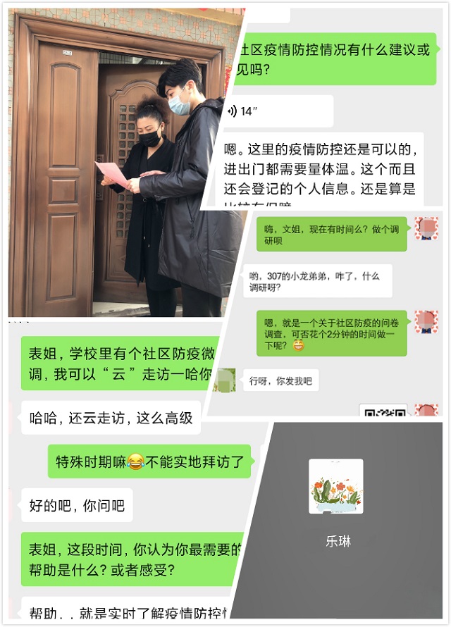 淬炼商学院、行政管理学院学生采用语音、视频、文字等形式就居民疫情期间的心理健康、对社区共建的建议和意见、自我反思等问题开展了线上“云”走访工作,“走访”了社区居民、亲戚、同学、朋友等,为微调研做好大数据信息采集工作。
