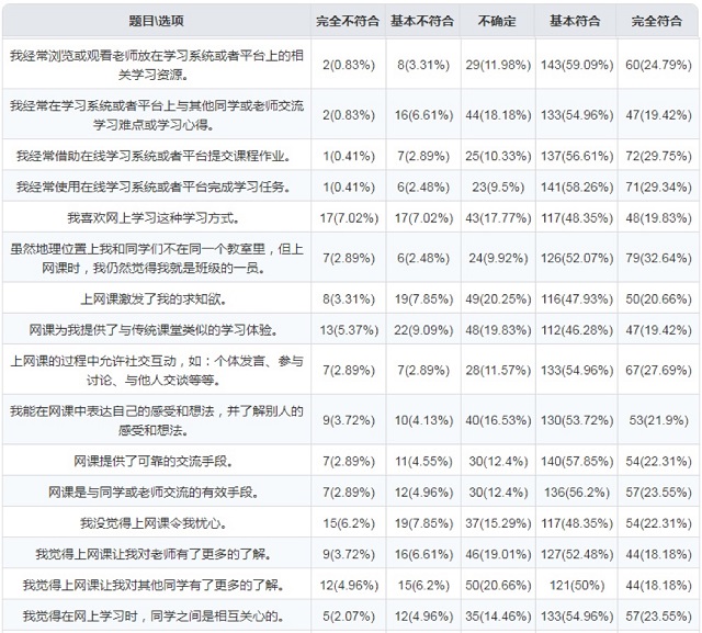 本次调查对象为学院260名学生,发出问卷调查表260份,回收242份,回收率93%,基本反映了学生对于网络课程的整体评价。在问卷中随机选取几类典型的问题,通过问卷星平台的数据分析功能,导出以下分析数据: