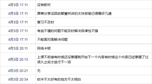 结果反馈及应对措施:相比传统授课形式,网络授课突破时间和空间上的限制,从根本改变了传统的教学方法和手段。因此,人机交流多了,对学生自觉性要求高了,作业作为巩固学习效果的重要手段,在网课下也面临着挑战。为提高学生网络课程听课效率,在今后开展学生工作中,科学细致安排,提升管理学生效度,留给学生足够的时间预习、听讲、作业、互动、反馈、检测、巩固;加强日常督促与提醒,养成自律行为;展示学生优秀作业,调动学生学习积极性;推心置腹沟通,深耕家校合作深度。