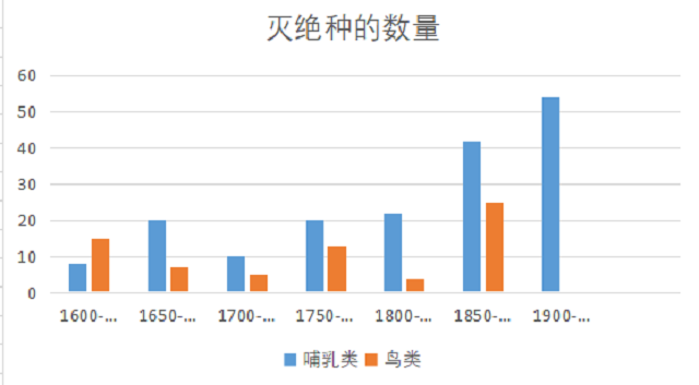 图一为百度百科中对哺乳动物和鸟类灭绝数量的统计,可以发现灭绝的数量虽小有波动,但整体趋势呈现不断攀升状态,由此可见动物生存形式严峻,虽没有近些年数据,但看此趋势并不会有好转。