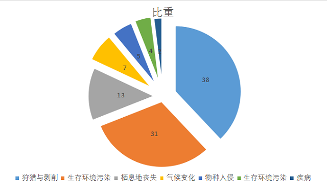 在百度百科中搜集数据后形成图二与图三,用图表形式,直接展现造成动物灭绝的因素,不难看出,动物灭绝的原因中,人类因素占据了80%,导致物种多样性降低的最关键因素是人类直接猎杀与捕食,第二大原因生态污染与人类更是密不可分。