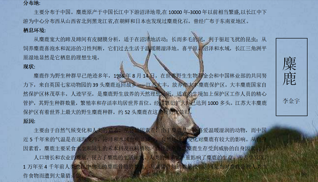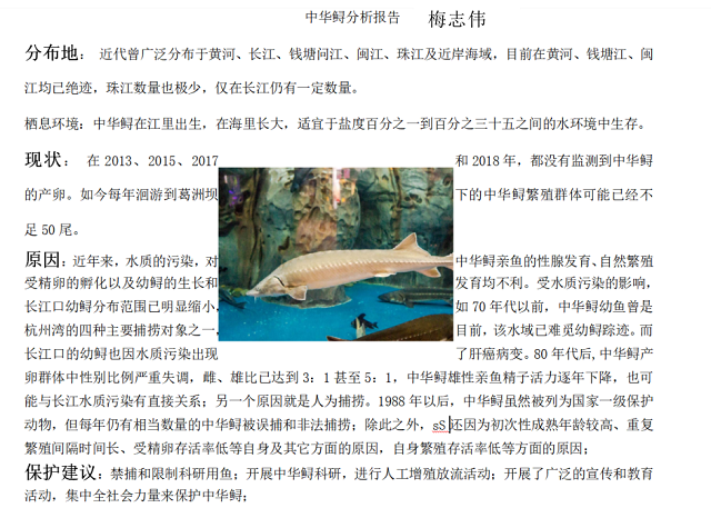 渡渡鸟、大海牛恐鸟、蓝马羚、大海雀、南极狼等等,都已经消失在世界上一个个名字像一道道伤口,刻在人类的肌肤之上,现有的珍惜动物如不能再得到最好的保护,终有一天,会成为人类心口上一道抹不去的疤痕。下图为同学们调查搜集专一动物的资料后整理形成的报告,深刻反思珍稀动物数量减少的原因,反思自身,提出方案。