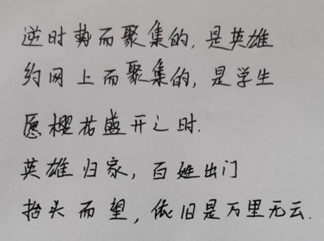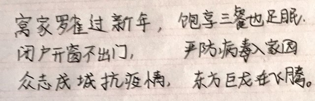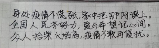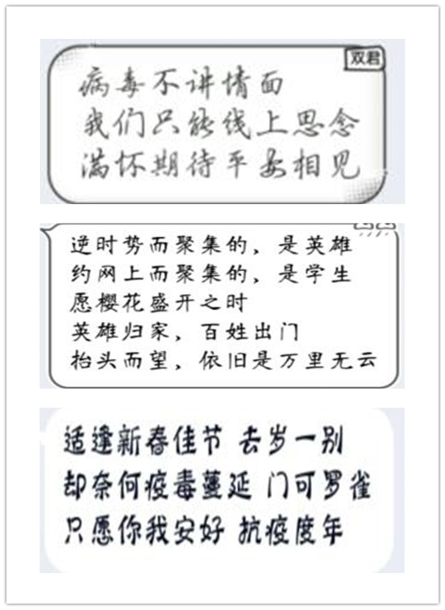 创作过程中,大家满怀着“抗击疫情 声援前线”的心情,即使不能相见,字里行间也透露出祖国早日战胜疫情的殷切期望。个人写作成果展示后,同学们借助聊天工具,相互分享交流,“吐几言心事”。他们互相吸取经验,交流感悟,才华不断涌现。在经过同学们不懈的努力,最终落笔形成了数篇作品。