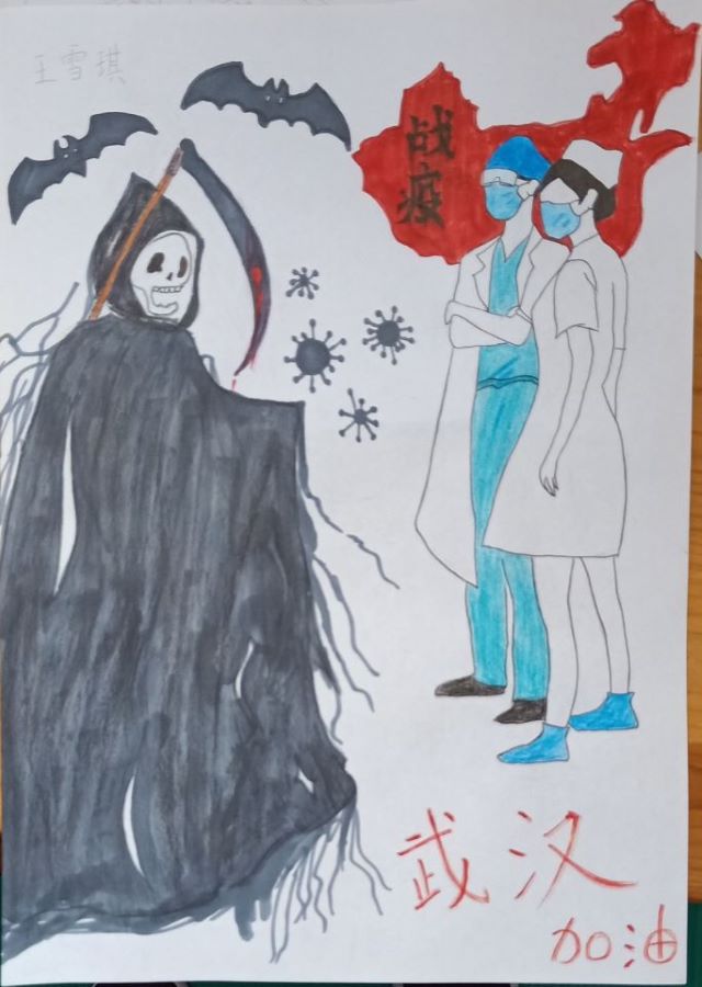 同学们有为白衣战士们写信,作画,视频祝福感谢的,希望在一线的医护人员平安归来;还有通过图文并茂为武汉的市民们和中国加油的,期待着疫情结束。我们将此制作成视频转交到武汉中南医院的邮箱里,希望为全副武装的“逆行者”们送去问候。