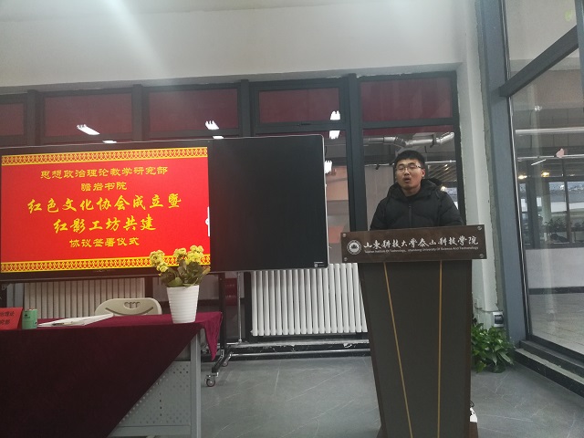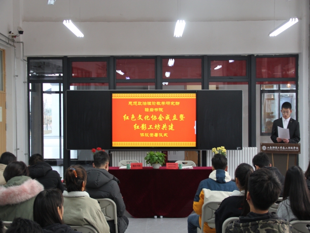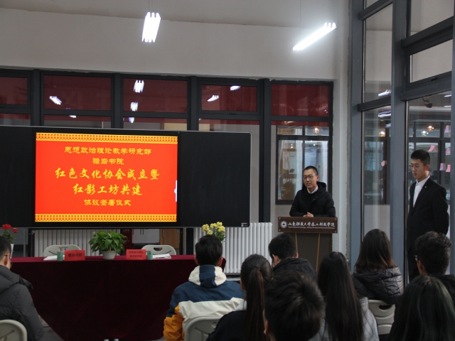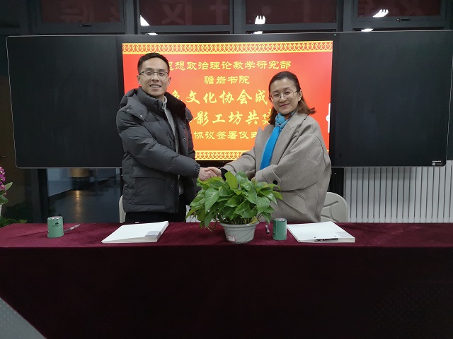 12月18日下午,红色文化协会成立暨红影工坊共建协议签署仪式瞻岩书院114功能室举办。思想政治理论教学研究部部主任解嵘、瞻岩书院负责人白军彭、两院全体教师以及红色文化协会全体成员参加了仪式。