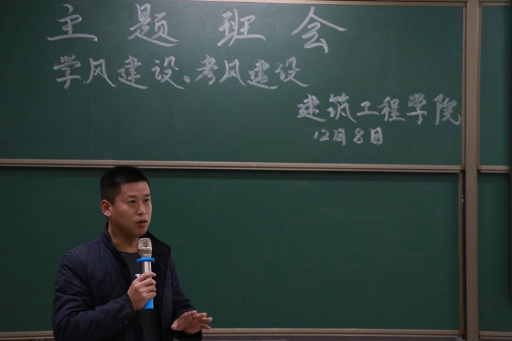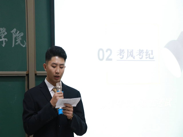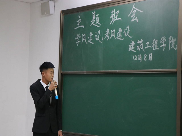 首先,马栋老师就学风建设和考风建设作了简短的讲话,之后班会主持人张文豪同学对本次班会做了简单的介绍,本次班会分为两部分,一部分是由潘兴胜讲解的学风建设,另一部分是由孙珂讲解的考风建设。