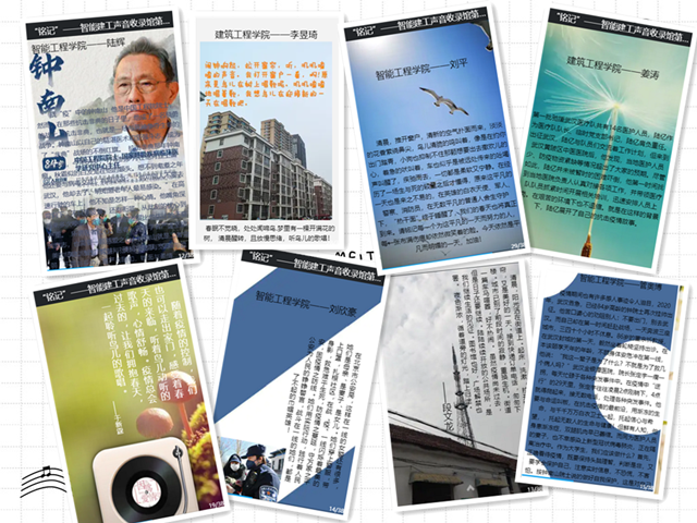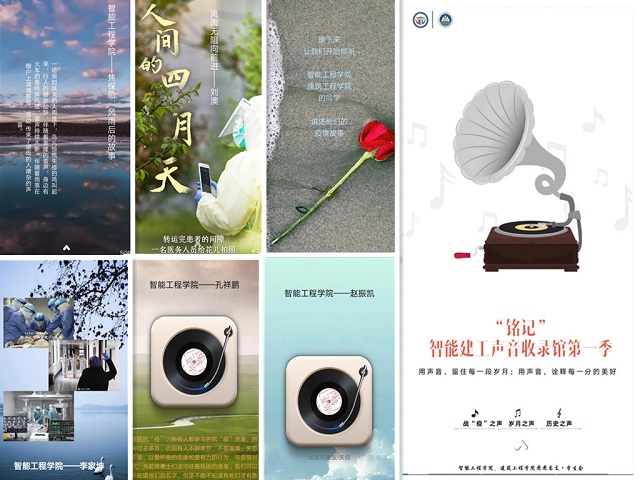 2020年3月26日,由智能工程学院、建筑工程学院团总支·学生会艺术团举办的“‘铭记’智能建工声音收录馆第一季战‘疫’之声”活动正式启动,启动之初便受到了两院同学的踊跃报名,一周的活动期间,一段段声音陆续上传至智能建工声音收录馆。在声音收录馆中,有讲述战“疫”过程中的令人感动的英雄事迹的声音;有讲述自己的战“疫”故事的声音;有解封后街道重回热闹的叫卖声;有家人朋友们重聚一堂的欢声笑语;有治愈人心的烹饪饭菜的声音;有清晨生机盎然的鸟鸣声;有……一部部不同的作品,一个个不同的声音,却同样体现着两院学子对国家战“疫”的关注,对英雄的尊敬与敬佩以及对于疫情好转的振奋心情。