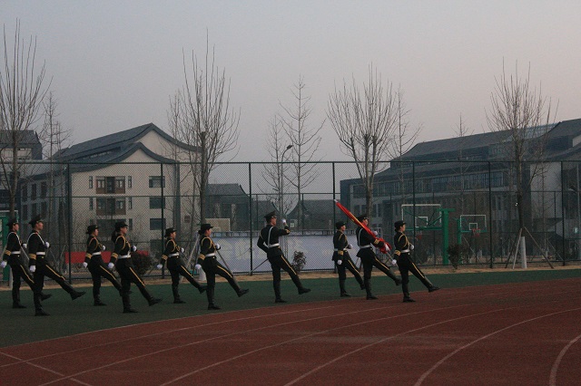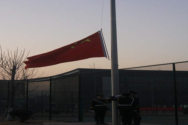 七点整,国旗护卫队的旗手们迎着朝阳,以饱满的热情,庄严地护卫五星红旗。当雄壮有力的《义勇军进行曲》响彻整个校园时,同学们集体注目着唱着国歌,全场弥漫着庄严肃穆的气息。鲜艳的五星红旗冉冉升起,激起了同学们不断向上、努力进取的斗志,点燃着同学们强烈的爱国热情。