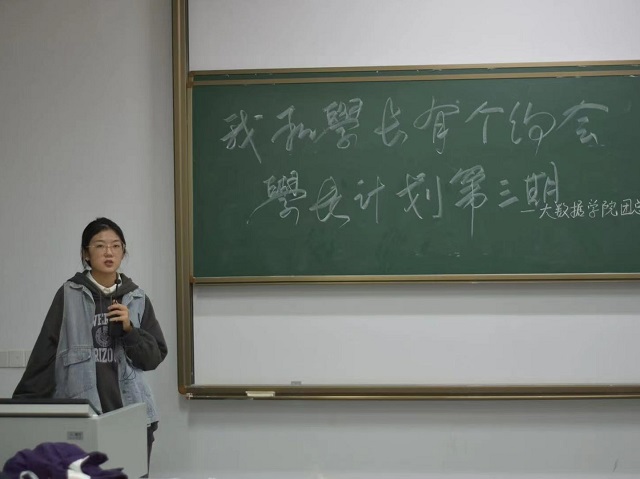 为了帮助新生快速适应大学生活,找到人生方向,树立正确的人生观,价值观,合理规划大学生活。10月29日19:00,大数据学院团总支·学生会组织部举办了“我与学长有个约会”第9期专题讲座,此次讲座邀请到了计算机科学与技术2021级9班马文丽同学和同学们进行经验交流。