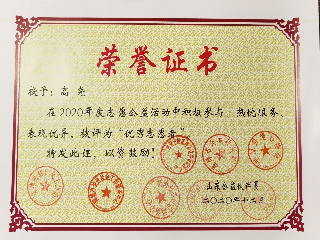 志愿服务使高尧同学成长了许多,也收获了许多,他先后获得了2019年度“优秀志愿者”、2020年度“优秀志愿者”、临沂市关工委孤困儿童心理辅导志愿服务团“优秀志愿者”、兰山区孤贫儿童志愿服务工作“优秀志愿者”等诸多荣誉证书,志愿汇累计志愿服务时长460多小时。