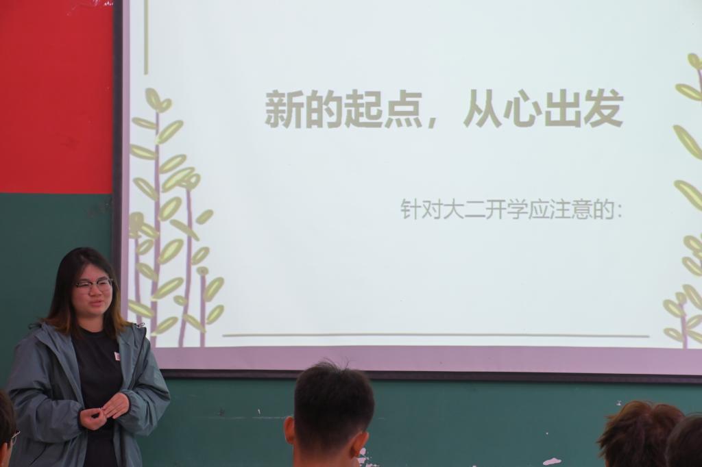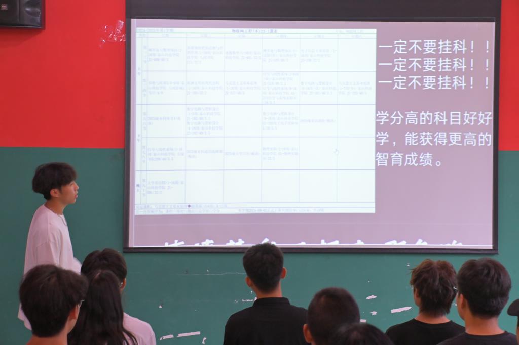 最后,李文昊学长以“大二该做什么”为主题进行了分享。他提出大二先学会与自己“和解”,强调提前规划人生的重要性,并指出不能仅仅局限于课堂学习,还需拓展课外活动和实践经验,“总有一些比上课重要的事——运动、旅游、交友”。他特别提到了学业成绩的重要性,告诫大家不能挂科,因为这可能会影响将来的职业选择和升学道路。李文昊学长的话语中,透露出了对学弟学妹们成长的深深期许与关爱。