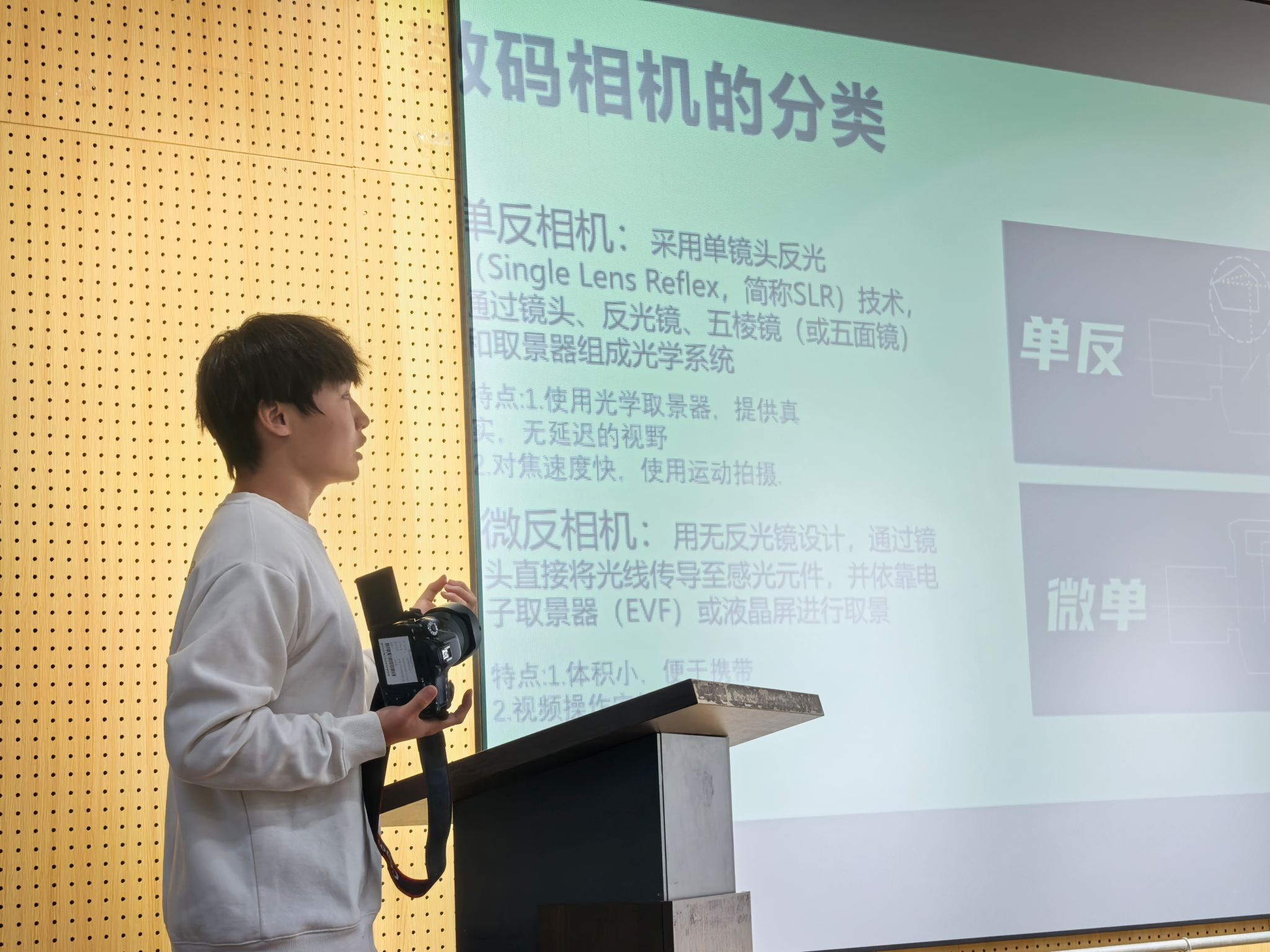 活动开始首先由新媒体中心部门部长张智皓向大家介绍摄影最基本知识,相机的分类与相机的构成以及相机成像的原理,让大家对摄影与相机有基本了解,然后进行相机各功能的介绍,让大家会使用相机进行拍照,最后给同学讲解相机怎样拍好照,对摄影的基本知识进行宣讲,同学们积极听讲与记下笔记。