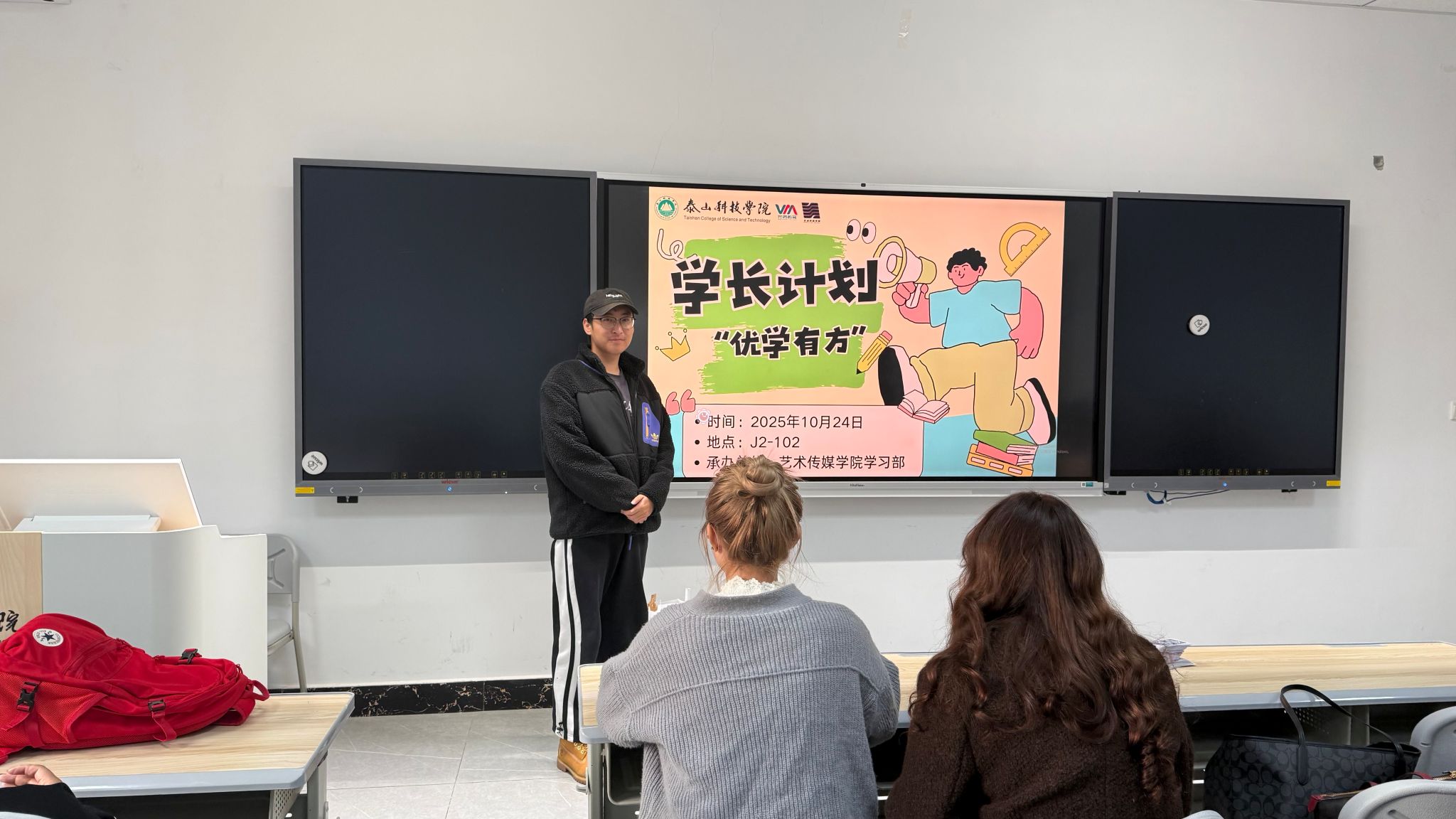 为了帮助同学们更好地适应大学生活,艺术传媒学生会·学习部于10月24日下午在j2-102举办了一场主题为“优学有方”的学长分享会活动。在这个阳光明媚的日子里,新老生齐聚一堂。学长,学姐们以过来人的身份,分享着自己在学习、生活和社团活动等方面的宝贵经验。他们用生动的语言讲述着曾经的奋斗历程,鼓励学弟学妹们勇敢追求梦想,积极面对挑战。