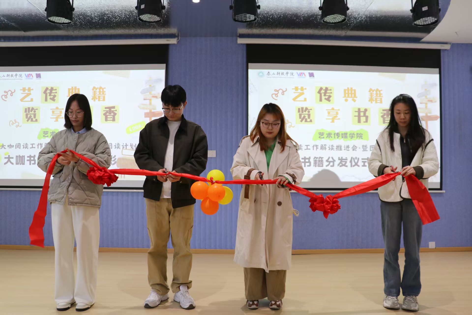 最后,九河书院综合办主任赵瑾、五汶书院发展导师刘宏祥、艺术传媒学院团总支书记任子璇以及学院大咖阅读活动负责人刘文香、辅导员闫鹏斐共同为图书阅读计划剪彩,标志着艺术传媒学院“大咖阅读”系列活动正式进入全面推进阶段。剪彩仪式简洁而庄重,象征着学院对阅读文化建设的重视,也为全院学生搭建了一个交流学习、提升自我的优质平台。