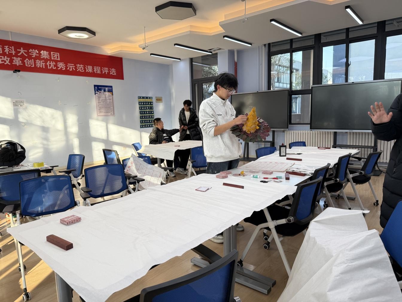 书法爱好者与新手同学的“师徒结对”环节,成为现场最暖的风景线。“写‘笃’字的竖画要稳,像扎根的大树,慢慢沉力”,曹圣寒同学握着沈瑞晨同学的笔轻声指导;笔尖在宣纸上渐渐舒展,墨痕里不仅藏着书法技艺的传承,更盛着同窗间的温情。班长张楚晨计划将这些“师徒合作”的作品打造成班级文化墙,让这份墨香里的温度,成为班级“传艺又传情”的专属印记。